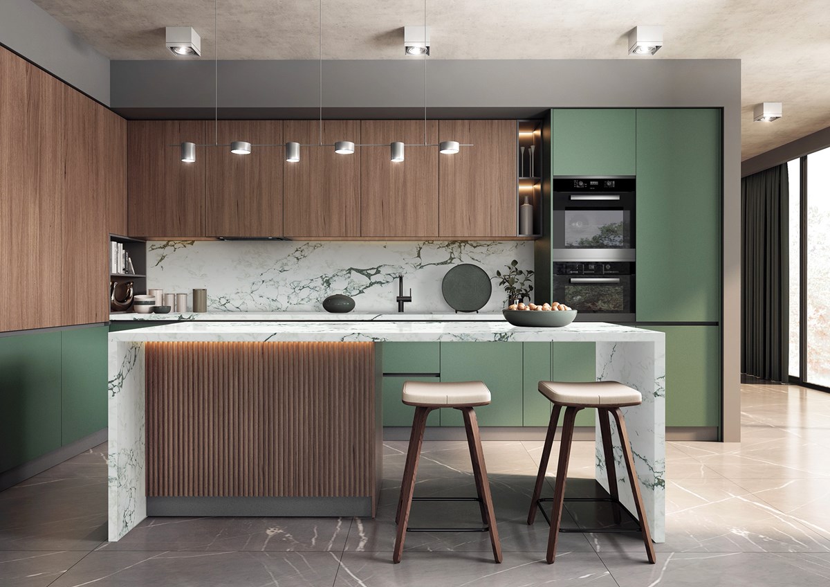 Verde Fantastico Quantum Zero Slab Polished. Developed with advanced technology, Quantum Zero recycled surfaces are crystalline silica free, making them the perfect choice for kitchen benchtops, splashbacks, bathrooms, laundries, and commercial spaces.