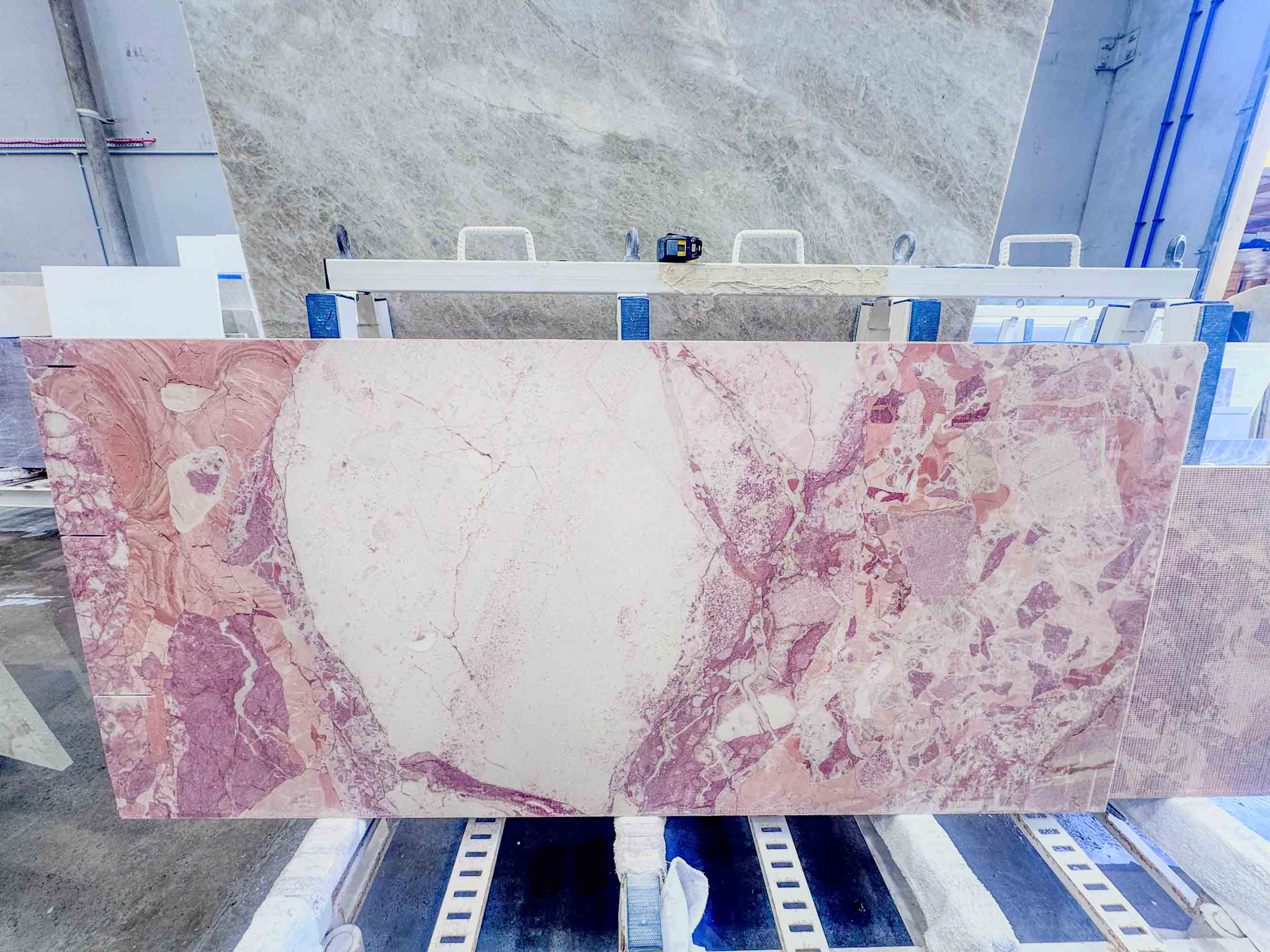 Breccia Rosso Honed Marble features intense burgundy tones interwoven with pink, gold, white, and beige veining, creating a dramatic mosaic-like natural stone. Off cut ideal for bold marble benchtops, feature walls, fireplaces, bathroom vanities, and luxury interiors.