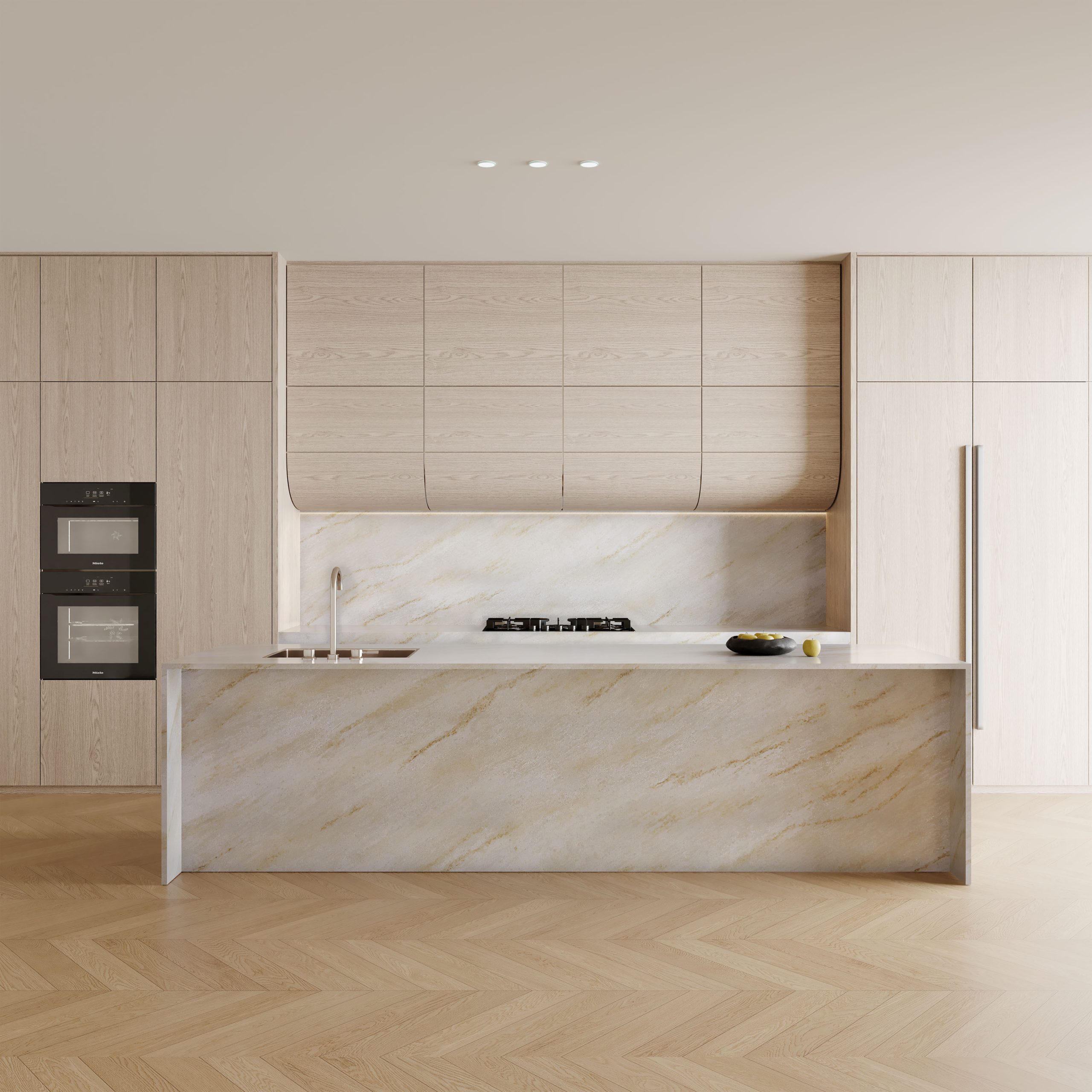Dune Matt features a soft silvery-grey base with subtle, dune-like veining inspired by Taj Mahal quartzite. Its gentle movement and matte finish diffuse light beautifully, revealing a calm, understated texture — ideal for modern, timeless spaces.