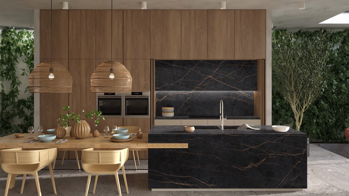 The Laurente Matte Slab from the QuantumSix+ Porcelain range is a bold choice for high-impact interiors. This stunning slab features a deep, velvety charcoal-to-black base, contrasted by striking copper and gold-toned veining that creates a luxurious and moody atmosphere. This QuantumSix+ Porcelain is available in bookmatch sets, allowing you to create a dramatic, mirrored feature on kitchen benchtops or splashbacks. Its matte finish provides a non-reflective, tactile surface that is perfect for contemporary or industrial designs. Engineered to withstand heat and stains, it is a high-performance alternative for any premium kitchen benchtop in Sydney.