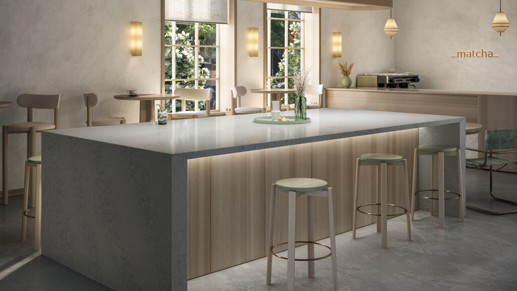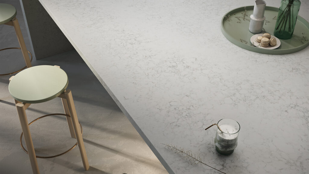 Lightcrest 5103 Caesarstone slab is a polished engineered stone with a powdery grey base and soft, mottled grey veining. Its subtle, harmonious pattern adds timeless elegance without overpowering, making this stone perfect for versatile kitchen benchtops, bathroom, and living spaces.