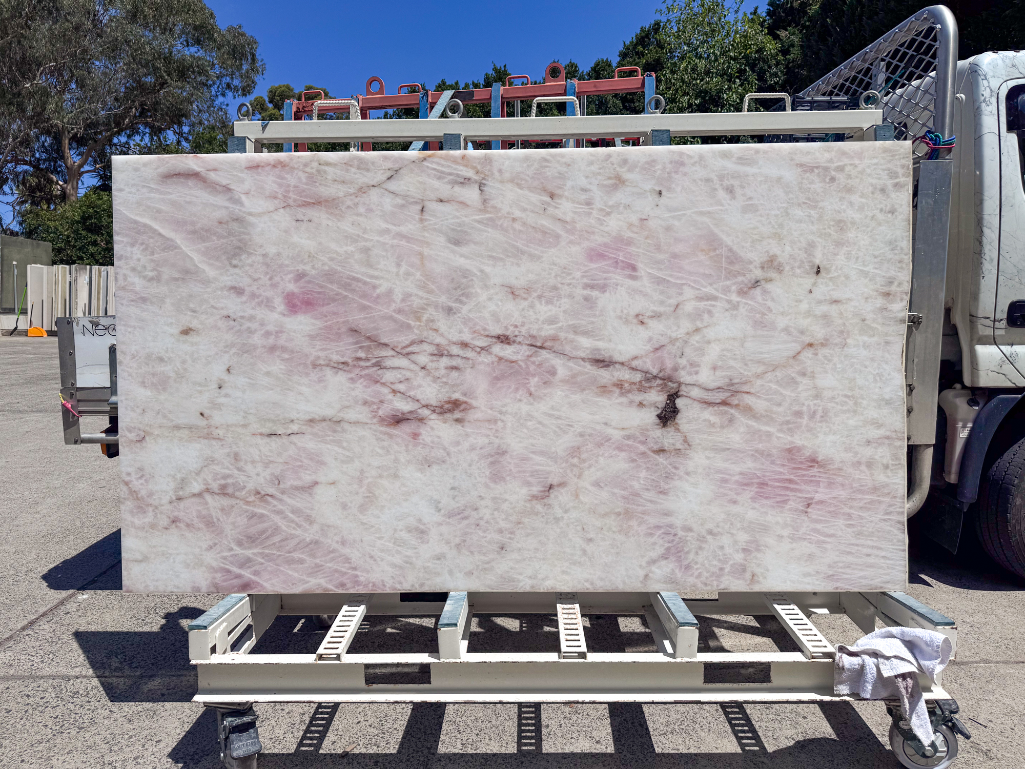 This Pink Cristallo Quartzite Off Cut radiates natural romance with delicate blush tones and subtle crystalline translucence. Its gentle veining and glass-like texture create refined statement pieces for quartzite benchtops, vanities, and luxury interiors.