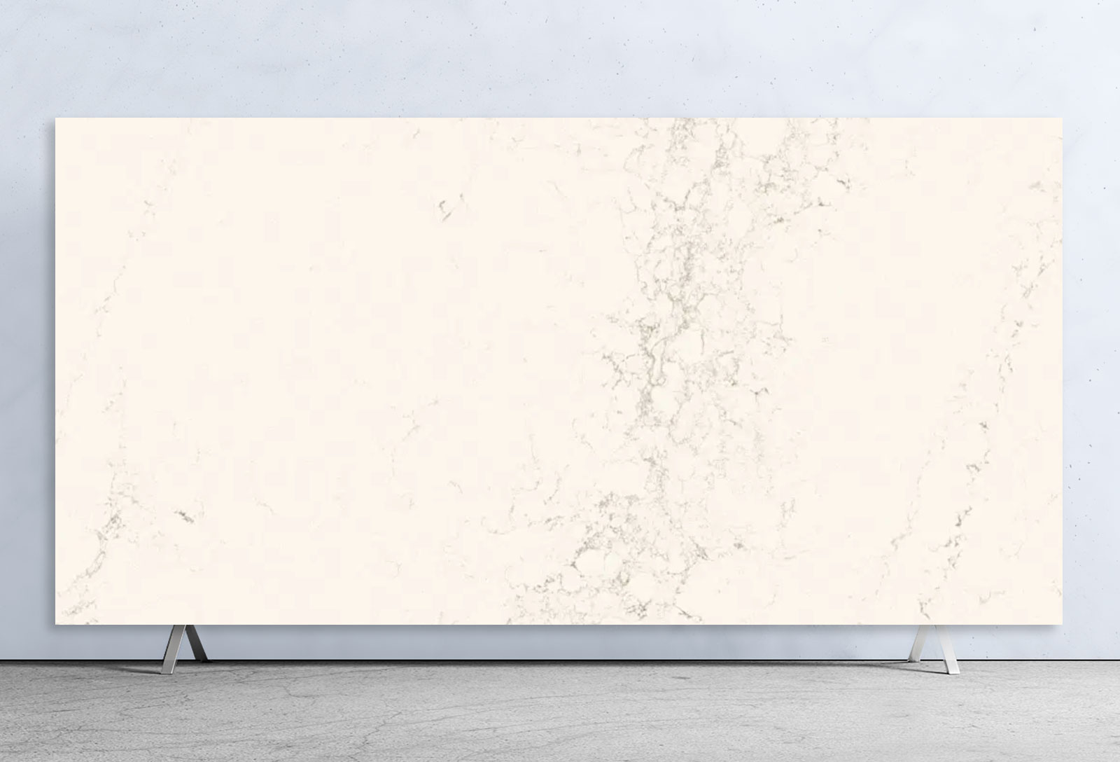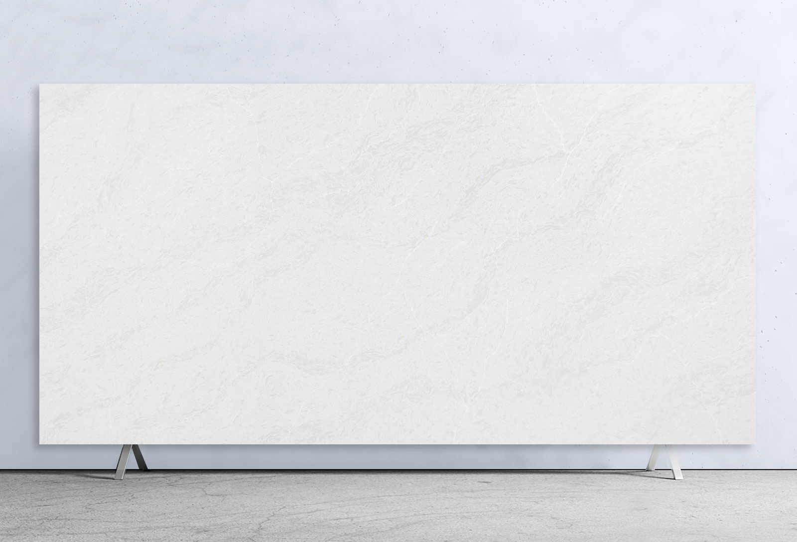 Cloudburst Concrete 4011 Caesarstone slab offers a soft white-on-white tonal patina over a creamy base, echoing the ethereal elegance of alabaster. Its low-reflective “Rough” matte finish pairs beautifully with light and dark timbers, stainless steel, and concrete surfaces, making it perfect for kitchen benchtops. Silica-free mineral slab with high-movement veining for unique, customizable stone benchtops.