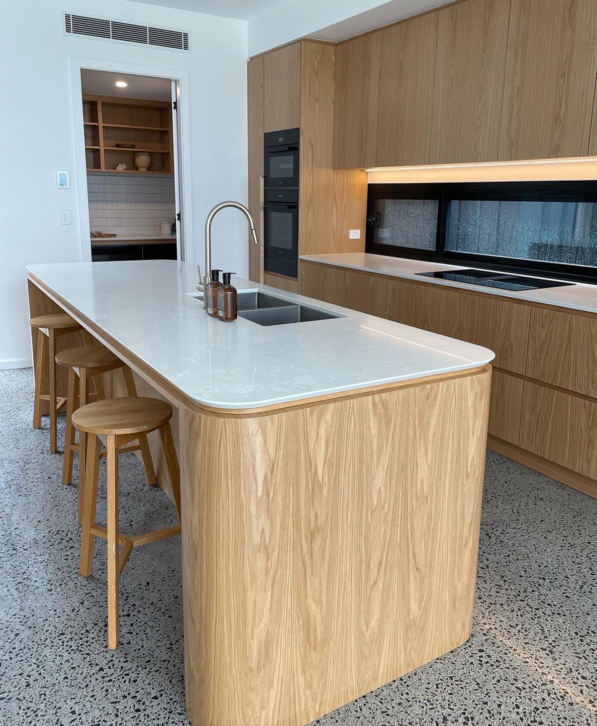 With the measurements finalised, we move on to the fabrication phase. During this stage, our skilled craftsmen begin creating the components of your kitchen, from custom cabinetry to benchtops and specialised storage solutions. Using high-quality materials and precision techniques, we ensure that every element is built to the exact specifications of your design. Our team carefully inspects each piece to maintain superior craftsmanship and durability, preparing everything for a smooth and efficient installation.