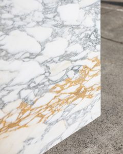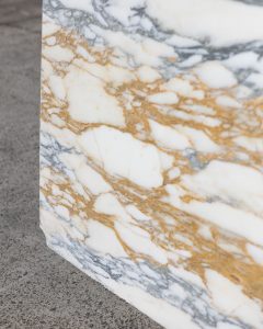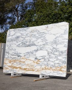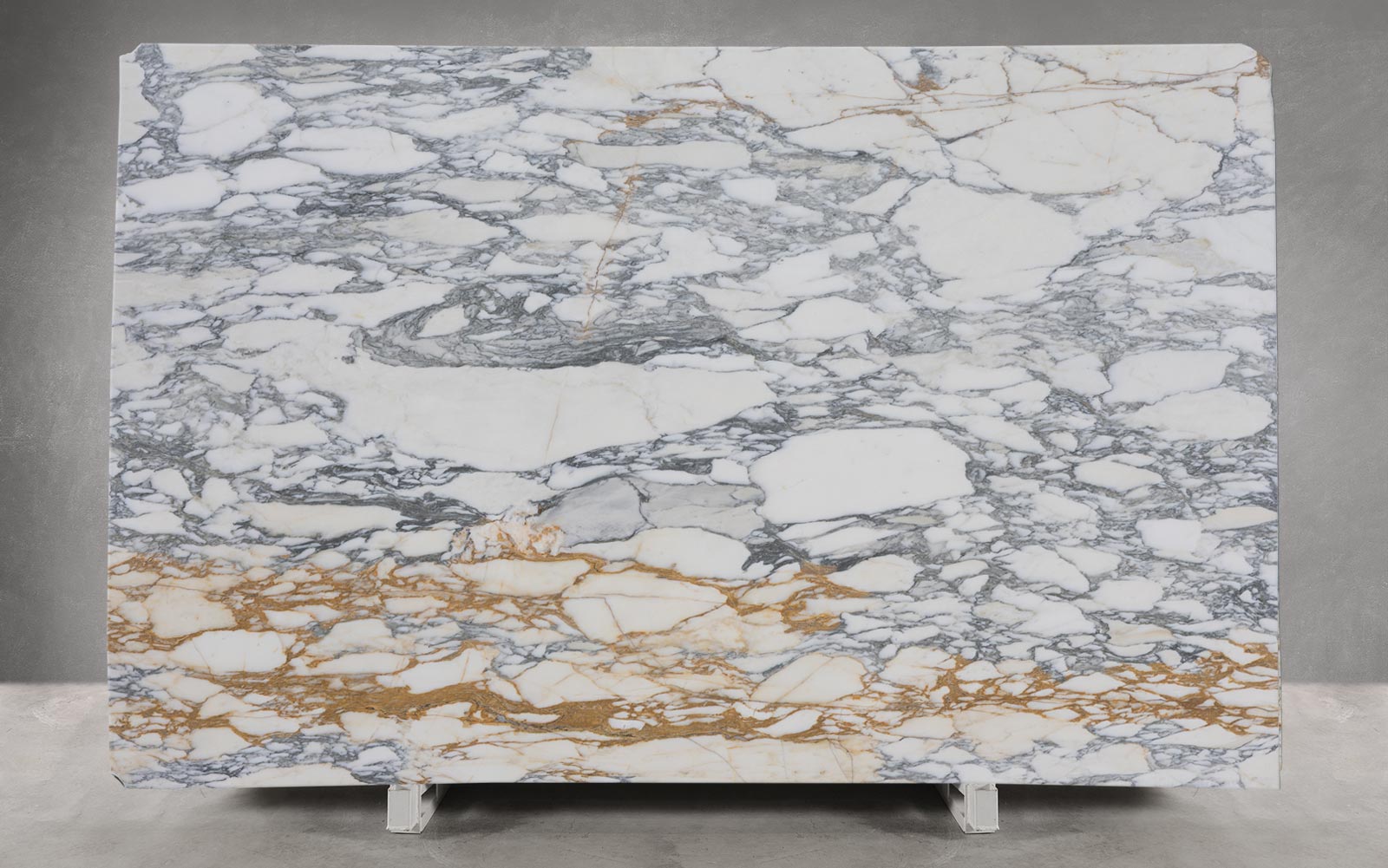 Arabescato Corchia Gold Marble is a premium natural stone featuring a luminous white base veined with warm gold and smoky grey accents, bringing opulence and sophistication to any setting. Its honed finish offers a soft matte surface that beautifully reveals the stone’s natural movement while lending a refined elegance. Perfect for kitchen benchtops, splashbacks, bathroom vanities, and feature walls, this marble blends dramatic style with long-lasting functionality. Sourced from select quarries, Block 1671 displays unique patterning and rich colour tones, making it ideal for both contemporary and classic interiors. Transform your space with the luxurious presence and enduring beauty of Arabescato Corchia Gold Marble.
