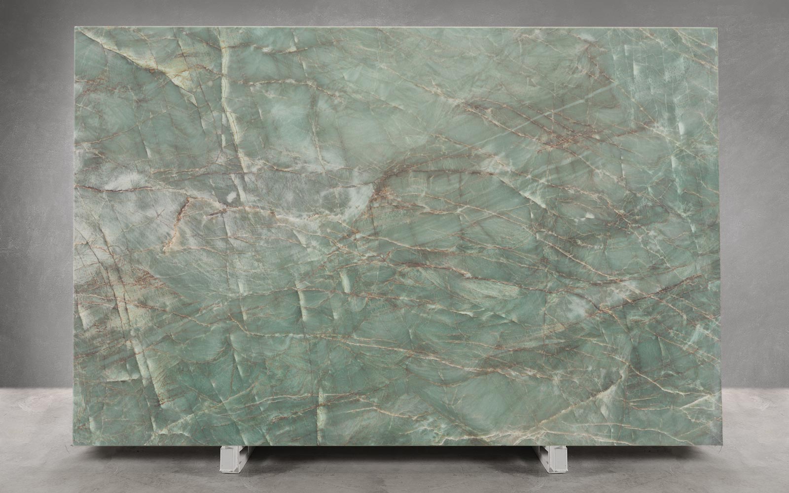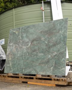 Esmeralda Quartzite, also known as Emerald Green, is a stunning natural stone characterised by its rich green base and intricate white and gold veining, creating a bold and sophisticated aesthetic. With a honed finish, this slab offers a smooth, matte surface that highlights the stone’s natural patterns while ensuring long-lasting durability. Perfect for kitchen benchtops, bathroom vanities, splashbacks, and feature walls, Esmeralda Quartzite adds elegance and luxury to both contemporary and classic interiors. Sourced from premium quarries, Block 1654 showcases the unique character and tonal variations of this quartzite, making it an ideal choice for high-end design projects. Transform your space with Esmeralda Quartzite, a refined stone that combines timeless beauty with enduring functionality.