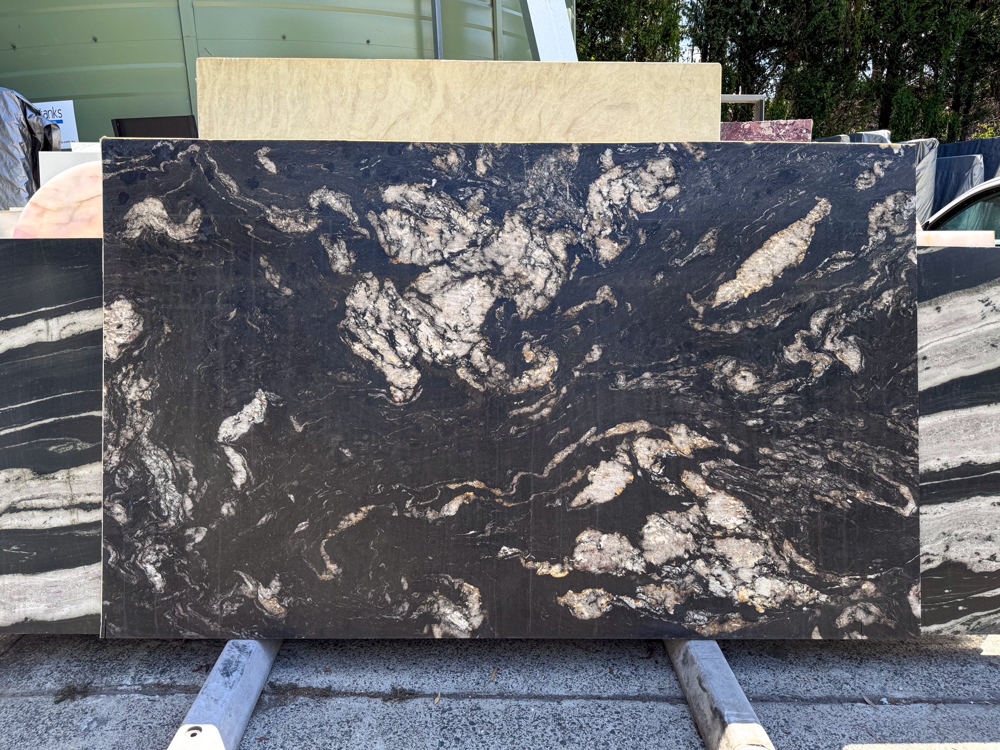 Titanium Gold Granite is an off cut which excels in beautiful movement, showcasing a bold blend of black, white, and gold tones. With a striking visual impact, is ideal for granite benchtops, bathrooms and walls.