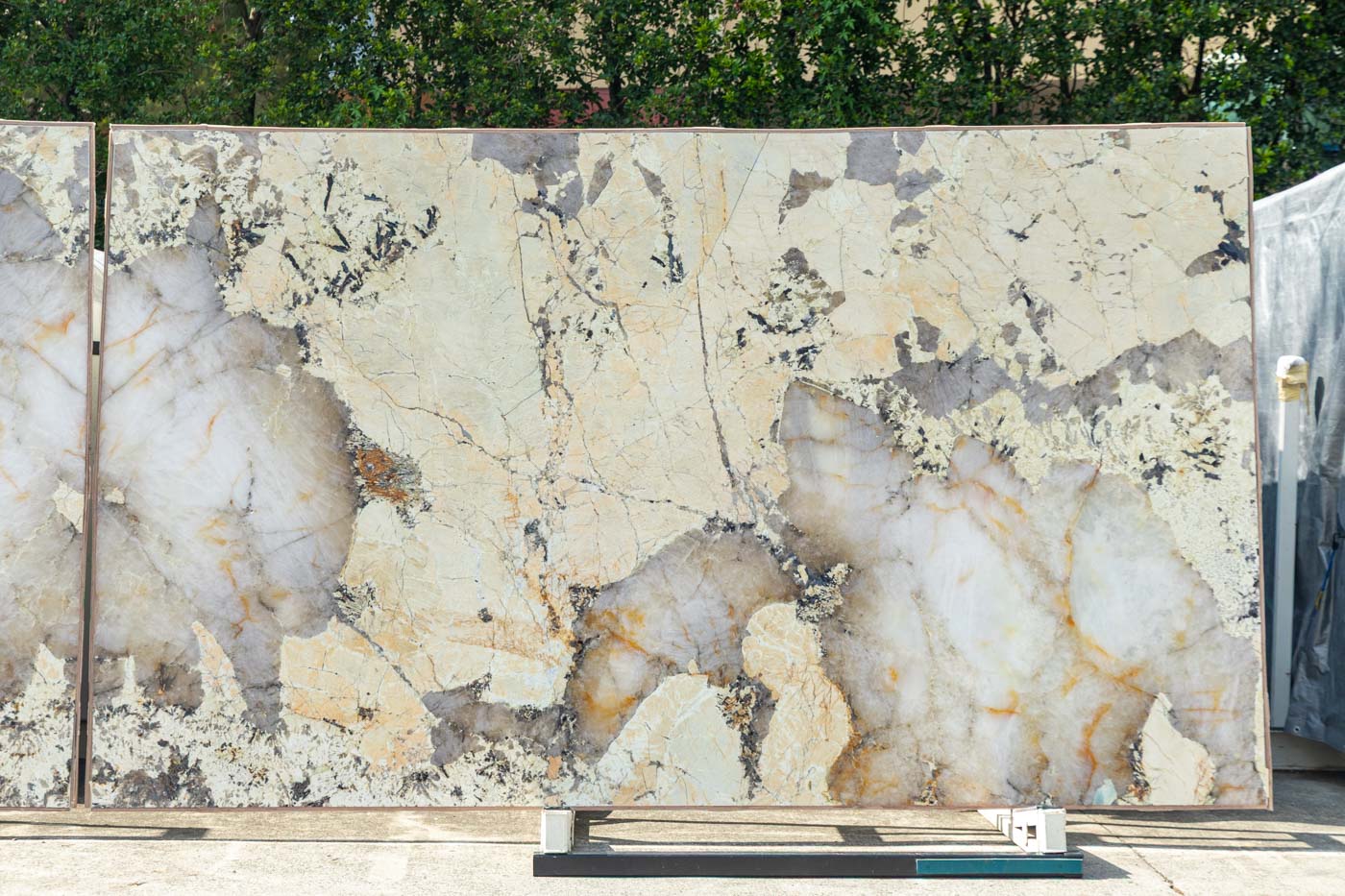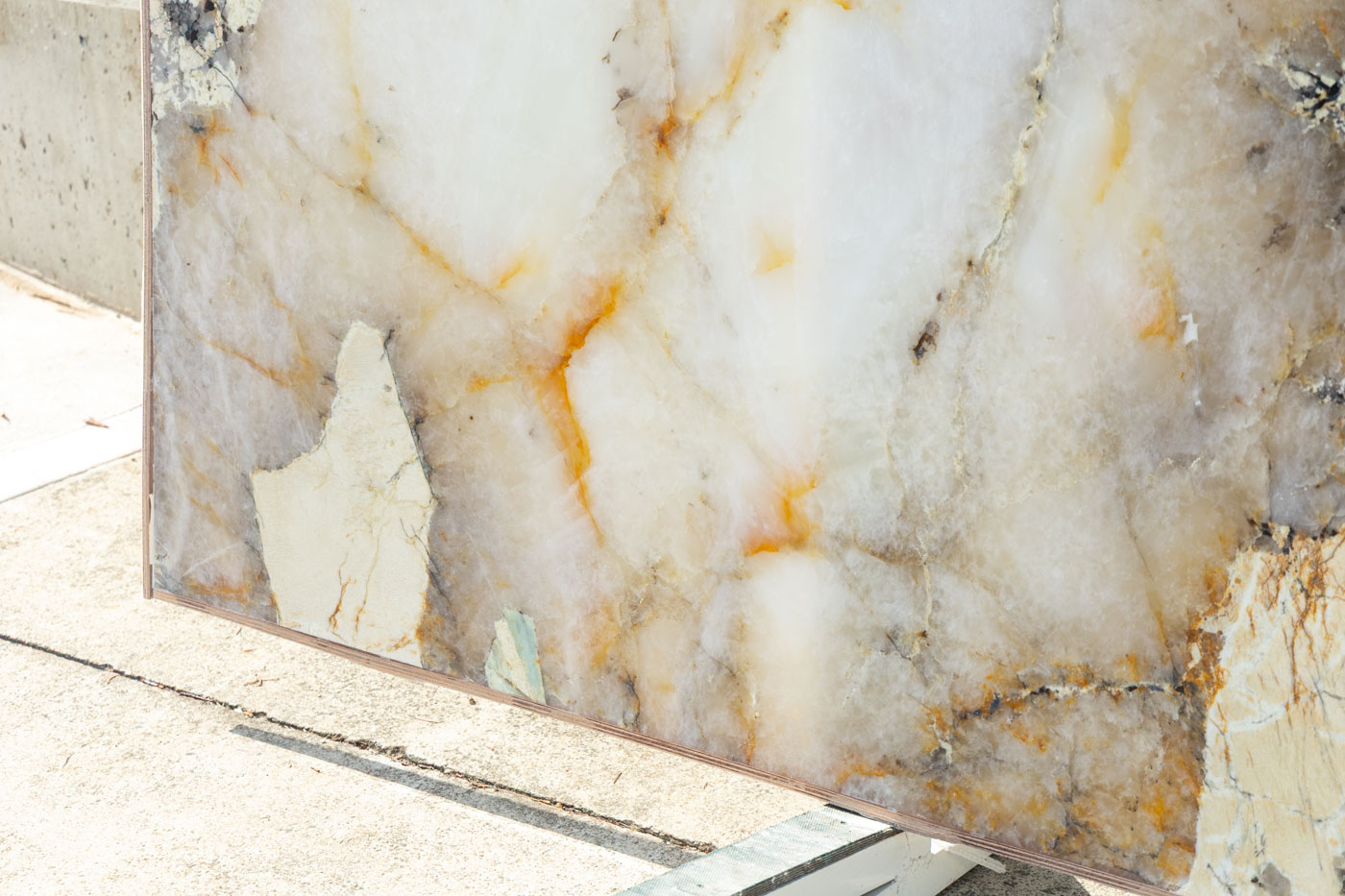 White Patagonia Quartzite slab brings the raw beauty of nature into your space with bold character and striking presence. Rich earthy tones flow through every slab, making each piece a one-of-a-kind statement with organic patterns and captivating natural variation. Featuring soft beige and light brown highlights over a creamy brown base, this quartzite also offers a subtle translucent quality for kitchen benchtops and splashbacks. This Patagonia Quartzite is a stunning natural stone for statement interiors.
